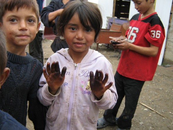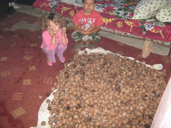 Many of the older children do not go to school and instead go to work with the whole family. First they started with picking up twigs from the riverside to make baskets, then picking the potato crop, and now it is time to collect the walnuts. The walnut trees belong to the state on both sides of the country roads and the Roma are allowed to pick up the walnuts and clean them from their green cover, then break and remove the shells and sell them to dealers to take to Hungary. I learned that three kilograms of unshelled walnuts gives one kilogram of shelled walnuts and is sold for 20-25 UAH (Grevnia), about $3. It is a time for everyone to work, even my preschool children 3 years old and up. They all have black hands and the stain gets to their faces too from cleaning the walnuts. It is a happy time—they have work and get wages. But sadly the children miss many days in school and they cannot catch up with the other students in the class. It is hard for the teacher to work with them, so they are left behind—they move them to the higher level and so on, but they graduate from 8th grade and do not even know how to write their names. They know how to count numbers but not read them.