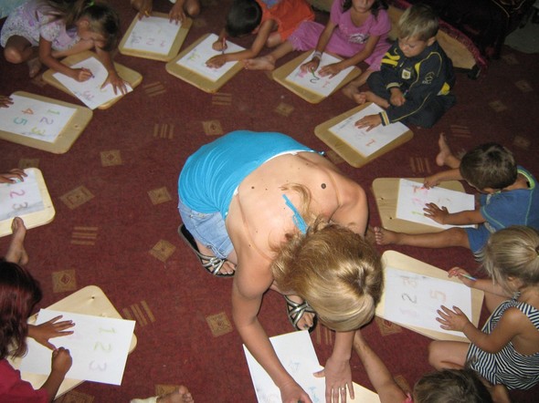 I thank God greatly because of my two helpers (Csilla and Naomi), who continue to do their best and work with the children and love them, and the children too, but the condition of the workplaces is not comfortable for both the teachers and the kids. When we started last year we brought tables and chairs, but the families took them for their private use and when I asked them to give them back they will not. So I asked Naomi's husband, who is a carpenter, to make wooden boards, which we give to the children to work on, then we take them back and I carry them in my car.